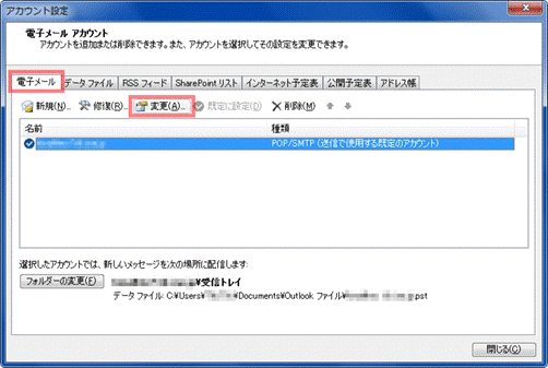 3. 【電子メール アカウント】が表示されます。変更するメールアドレスを選択し、【変更】をクリックします。