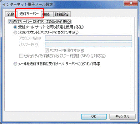 メールサーバーがセキュリティで保護されたパスワード認証 (SPA) に対応している場合には、チェック ボックスをオンにしてください |