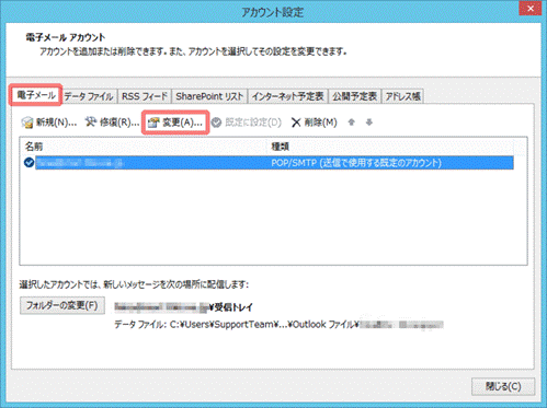 3. 【電子メール アカウント】が表示されます。変更したいメールアドレスを選択し、【変更(A)】をクリックします。