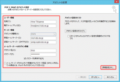 4. 【POPとIMAPのアカウント設定】が表示されますので、対象となる設定情報を変更します。