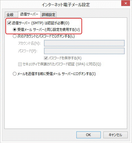 メールサーバーがセキュリティで保護されたパスワード認証 (SPA) に対応している場合には、チェック ボックスをオンにしてください |