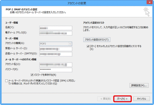 7. 【POPとIMAPのアカウント設定】の画面に戻ったら、「[次へ]ボタンをクリックしたらアカウント設定をテストする」のチェックが入っていることを確認した上で、[次へ]をクリックします。