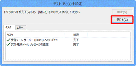 8. 【テスト アカウント設定】が開き、チェックが行われます。各タスクの状況が「完了」になれば、設定が正しく行われていることを示します。【閉じる】ボタンをクリックします。